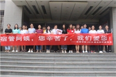 2018届全体女生集体向宿管阿姨献花致谢的场景格外动人,温情满溢。毕业生们悄悄相约,精心挑选鲜花、撰写感谢贺卡,表达她们对这位“爱生如子”的宿管阿姨的深深谢意和感动!一张张卡片、一句句祝福、一个个拥抱,无不饱含爱与感恩。同学们拉着阿姨的手,重温着阿姨年复一年、日复一日,婆婆妈妈的唠叨和简简单单的“滴水之恩”的温暖。“衣服破了,拿来我给你补补”,“下雨了,被子我给你们收到值班室了”“天气冷了,多穿件衣服”“感冒了,多喝热水”“出门一定把电源关了”“又没带钥匙,等会我给你开,下回一定记得出门带钥匙”“今天脸色不好,进来座会”……