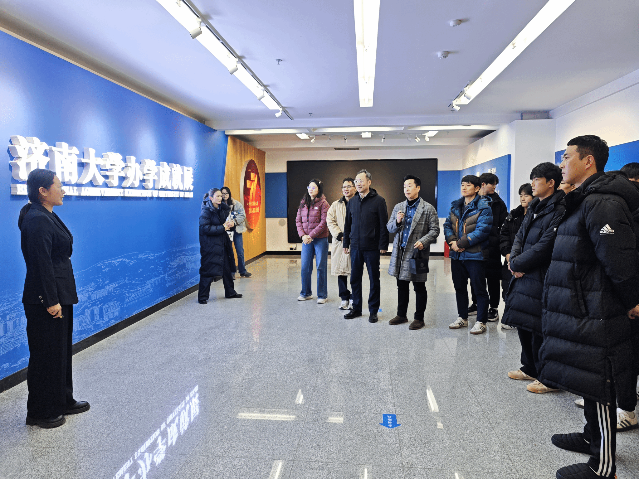 参观结束后,双方召开中韩体育发展交流座谈会。亓圣华代表学院对来宾表示欢迎,从学科布局、师资力量、特色项目三方面介绍学院发展——重点分享了学院在课程体系建设、高水平运动队培养、省级以上赛事获奖等方面的成果,展现学院在体育教育与竞技训练领域的扎实积淀。韩国飞翔跆拳道队团长全寅律则聚焦队伍发展历程,详细介绍韩国在跆拳道竞技训练、青少年人才培养、项目大众化推广等方面的经验与模式。