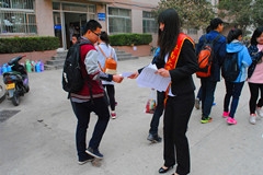 志愿者开始忙碌起来。一部分志愿者帮助环卫工人,扫除校园内的白色垃圾,剩下的同学们则是承担了发放问卷和宣传册的任务。在整个的宣传过程中,志愿者首先选取那些看起来并不匆忙的同学,递上环保宣传单,介绍校园存在的环境问题,详细地宣传生活中环保的小常识和必备的环保知识,并邀请他们做了关于环保的调查问卷。每一位成员都热情积极的投入到环保的宣传活动当中,一些热衷于保护校园环境的同学更是和志愿者们拍照留念。活动中,同学们在宣传册上签下了自己的话语,并承诺做一名爱护校园环境的文明大学生。