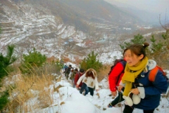 早上七点半,大家在领队的带领下,从济大西南门出发,乘坐大巴车前往活动地点——梯子山。在车上时,大家有说有笑,聊天谈心,领队还就此机会向社员简单介绍了活动流程以及梯子山的冬季风光,并对安全问题进行着重强调。抵达目的地后,大家稍作休息由领队带领踏上梯子山,三五成群,争相拍照留念。梯子山是济南第一高峰,风光秀丽自然浩瀚,而且现在正值冬季,厚厚的积雪,美丽的雾凇,和一群可爱的人儿,别有一番意境。梯子山山势陡峭,上山的简径小路是顽劣怪石混合着山泥野草,蜿蜒斗转,犹如架天长梯。本就险峻的山势加上厚厚的积雪使得山路更加难走,一路上同学们互帮互助,相互鼓励,兴致高昂,伴随着动感音乐和此起彼伏的欢笑,大家顺利登顶。行至中午,领队找了一片空旷地,铺上野餐垫大家就地进食。同学们乐此不疲的讲自己遇到的奇闻趣事,一起做游戏,就餐过程中气氛热烈而愉快。最后,社员在领队的带领下恋恋不舍得踏上归程。