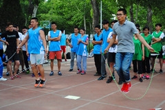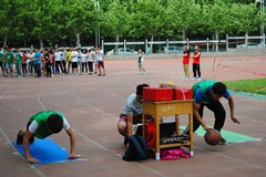 本次比赛有12个班,每班班派出2女8男共120人参赛。比赛第一轮采用两两班级PK,胜出的队伍进入下一轮。第二轮比赛采用计时的方法,将晋级的六组排出前三名。比赛开始每个班的排着整齐的队伍,开始先由10个跳绳开始,然后拿着接力棒跑的30米的地方,抽签选出自己的任务,有抽到吹气球的,有抽到侧踢的,还有抽到转圈的,各种题目,只有你想不到,没有他们设计不到的,然后接着托球跑20米,最后拿着接力棒冲刺,将接力棒传给下一个队友。大家纷纷为队员们送上震耳欲聋的喝彩,虽然女生没有男生跑得快但女生也毫不示弱,努力争先为班级争取荣誉。最终以体育1404班获得冠军,大家在欢歌笑语中结束了本次活动。
