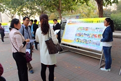 本次展览的主要内容是以义务支教、科学调研为主题开展的一系列实践宣传。展览板上图文并茂再现了济南长清第三中学大学课堂下基层支教团、威海文登沿海农村城镇化建设中居民健身状况调研队、济南市垃圾分类状况调研团、济南市舜玉社区“情暖空巢”实践调研团、济南市银座健身创业时间团及济南市贝贝轮滑创业实践团的积极探索进取精神和强烈的社会使命感、责任感,同学们看到了正在蓬勃发展的下乡活动投入到社会发展的方方面面,鼓舞着学生学好专业知识,学以致用,为社会主义事业贡献自己的聪明才智,全心全意为人民服务。 此外,参加下乡活动的学生悉心向老师讲解下乡内容,老师耐心听他们讲解,深入思考下乡真谛,并亲切的与讲解员进行交谈。