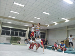 记者赶到时已经是6点10分,队员们已经开始做准备活动了——前后左右的摆腿,开合跳,吸腿跳,弹踢,倒立行走……杨老师则在一旁给队员们纠正动作:腿用力伸直,身体往上立,保持姿态。记者环顾了一下训练馆,最引人注目的要数写在横幅上的“敢拼敢搏敢赢,敢争敢夺敢胜,振济大体坛,扬体院精神”这二十二个大字。杨教练告诉记者:“横幅上的这些字是为了给队员们加油打气的,训练时,有些组合抛接和托举动作较多,危险性大,队员经常会出现失误,不小心掉下,摔的很疼,我希望他们看到这些字的时候能勇敢地站起来,我对他们给予了很大的期望。”休息时,记者采访到一位队员,当问到她为什么热爱健美操的时候,她是这样回答的:“我不仅仅是在跳健美操,而是在跳我的人生,健美操给予我的是一种向上的人生姿态,在做每一个动作身体都要记着向上立,这就像在生活中,不管遇到什么事情,要有一种积极的,不服输的,向上的姿态,而且教练经常教导我们,要想跳好健美操就要先学会做人,操如其人,当你把你的人生融进健美操里,你就能跳出你自己,拥有最美的姿态。”