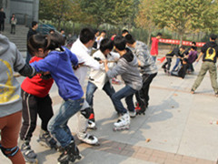 轮滑趣味运动会拉开了序幕,本次运动会项目主要由“轮滑拔河比赛”、“轮滑长跑”、“轮滑接力跑”、“两人三足”、“背靠背夹气球”、“轮滑花式表演比拼”、“极限轮滑比拼”等环节组成,整个过程现场的气氛十分火爆,众多同学驻足观看、叫好。在“两人三足”环节,各队表现出团队合作的力量,各位运动员奋力拼搏,不甘人后,充分体现出坚韧不服输的品格,他们精湛的轮滑技术与华丽的动作赢得了大家热烈的掌声。运动会高潮迭起,掌声不断,活动持续4个小时左右,在社员们的积极参与和精彩的表现中圆满结束。