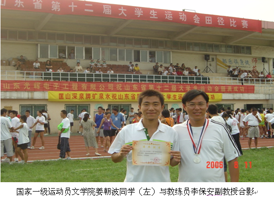 姜朝波获得男子甲组4*100米接力第二名,4*400米接力第八名,100米第四名,成绩10.93秒,获得男子200米第三名,成绩21.87秒,均达到国家一级运动员标准,这是我校有史以来自己培养的第一位国家一级运动员。