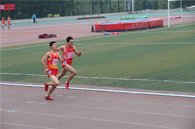 李韬同学(左一)与房高飞同学在男子甲组400m栏决赛后合影
