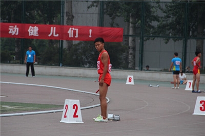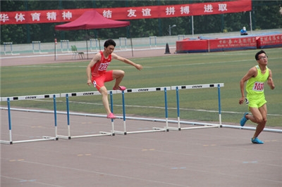 王一川同学(着红衣者)在男子丙组400m栏比赛中,他的400m栏成绩超过了国家二级运动员标准