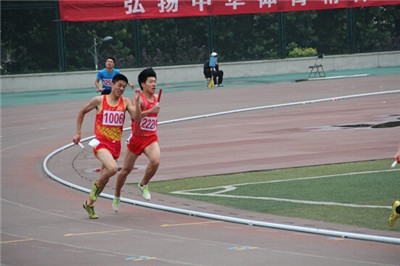 刘振同学(前者)在男子甲组4*400m接力第2棒比赛中